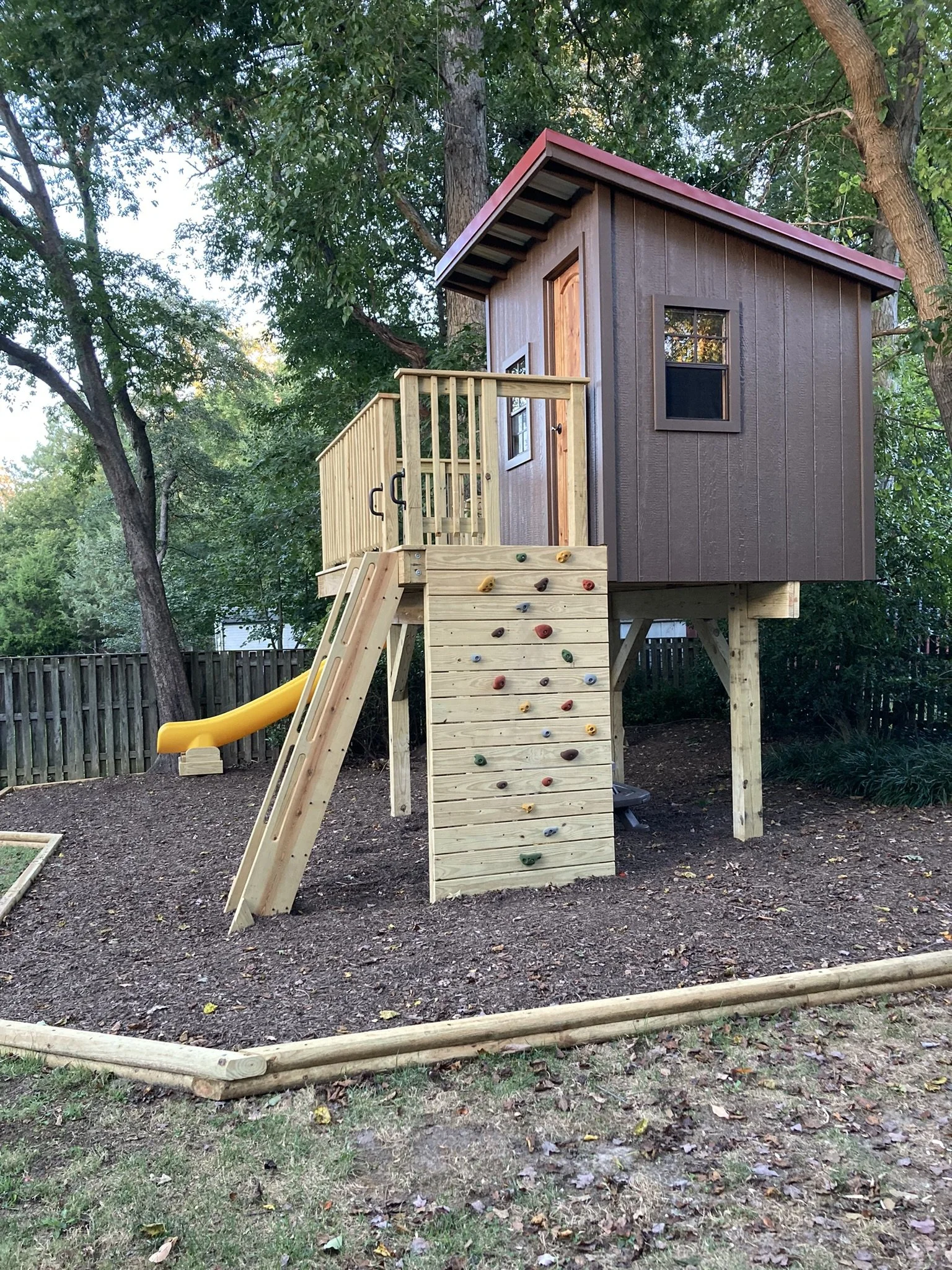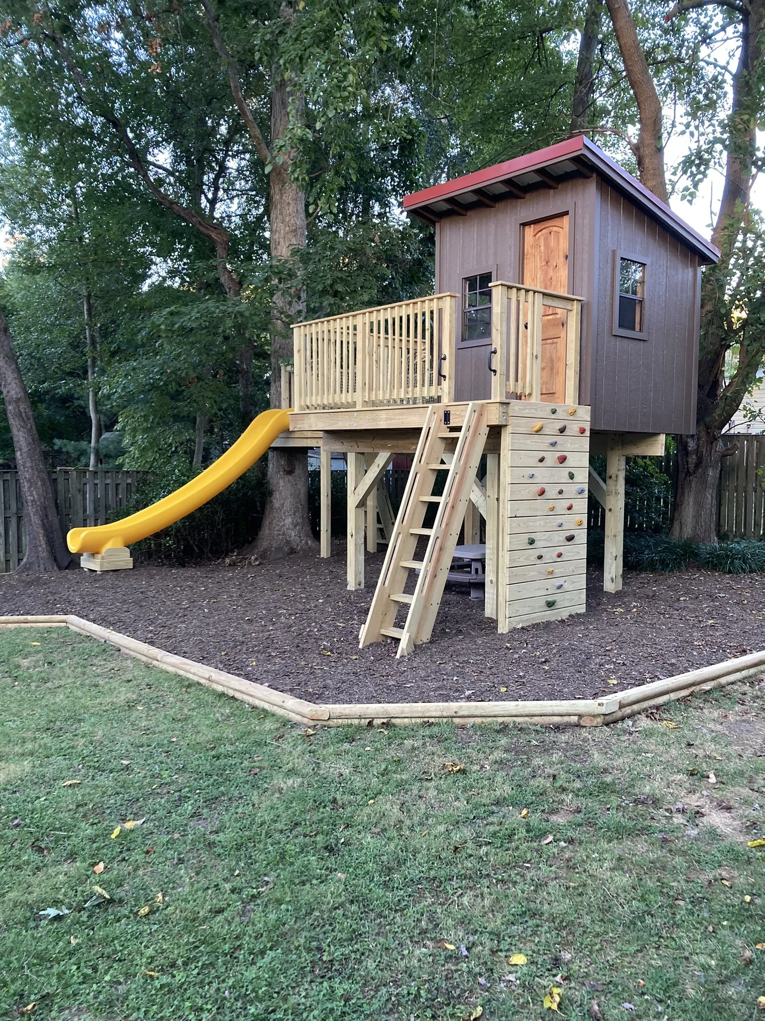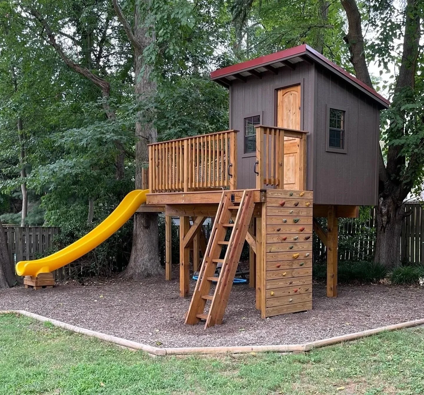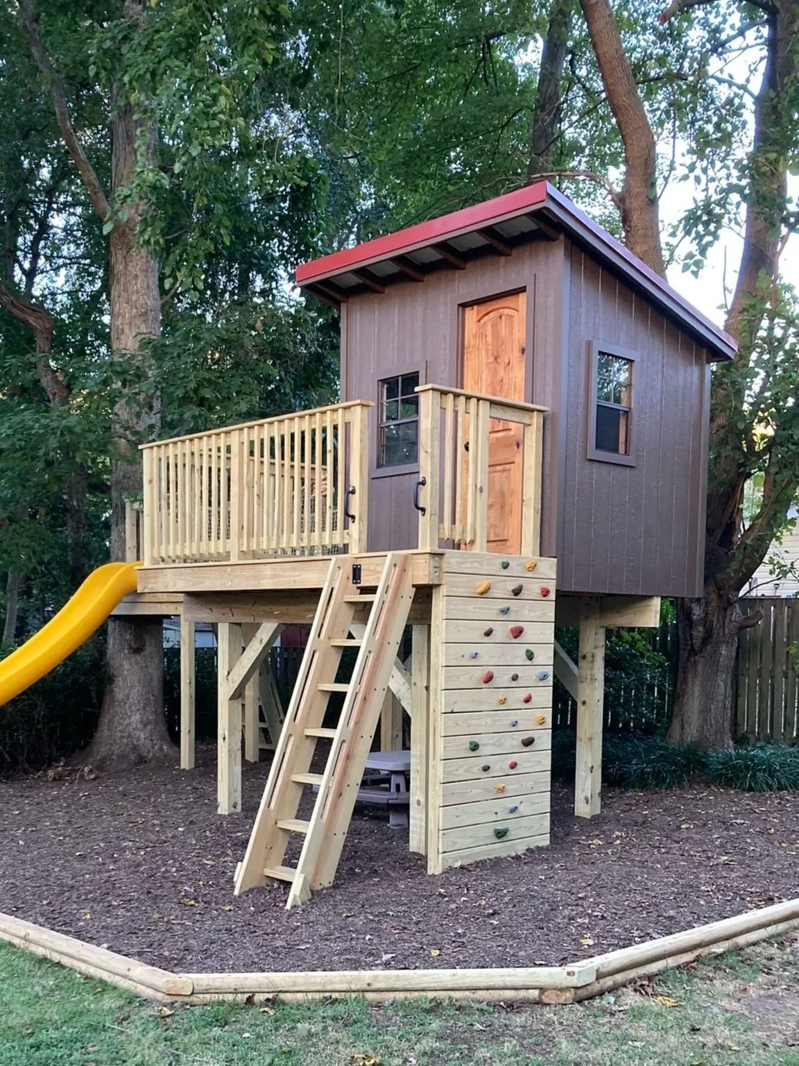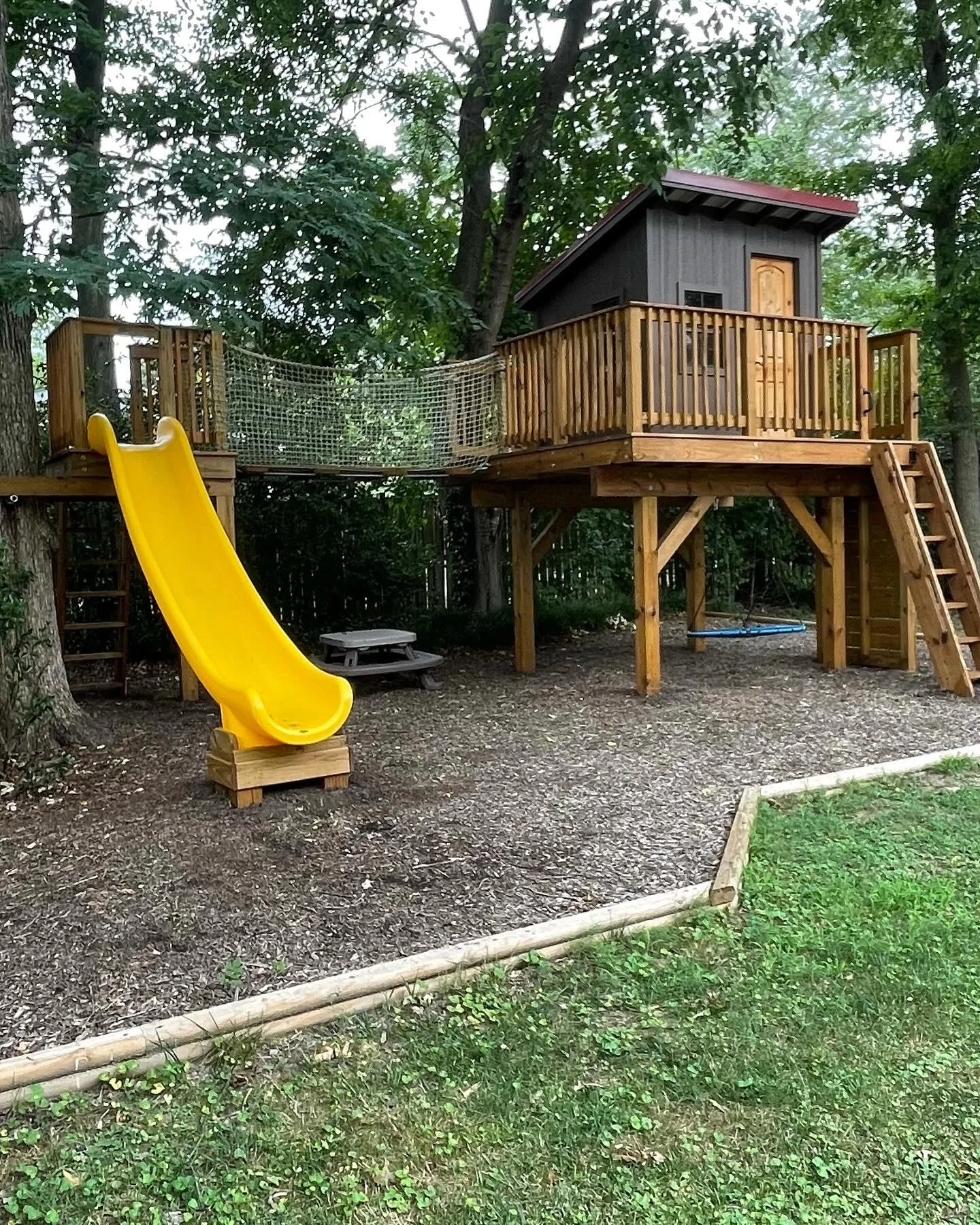 This elevated treehouse features a fully enclosed playhouse with windows and a door, connected to an open deck by a rope bridge. Complete with a bright yellow slide, climbing wall, ladder, and backyard swing, it’s a one-of-a-kind playscape designed for hours of adventure and imaginative play.