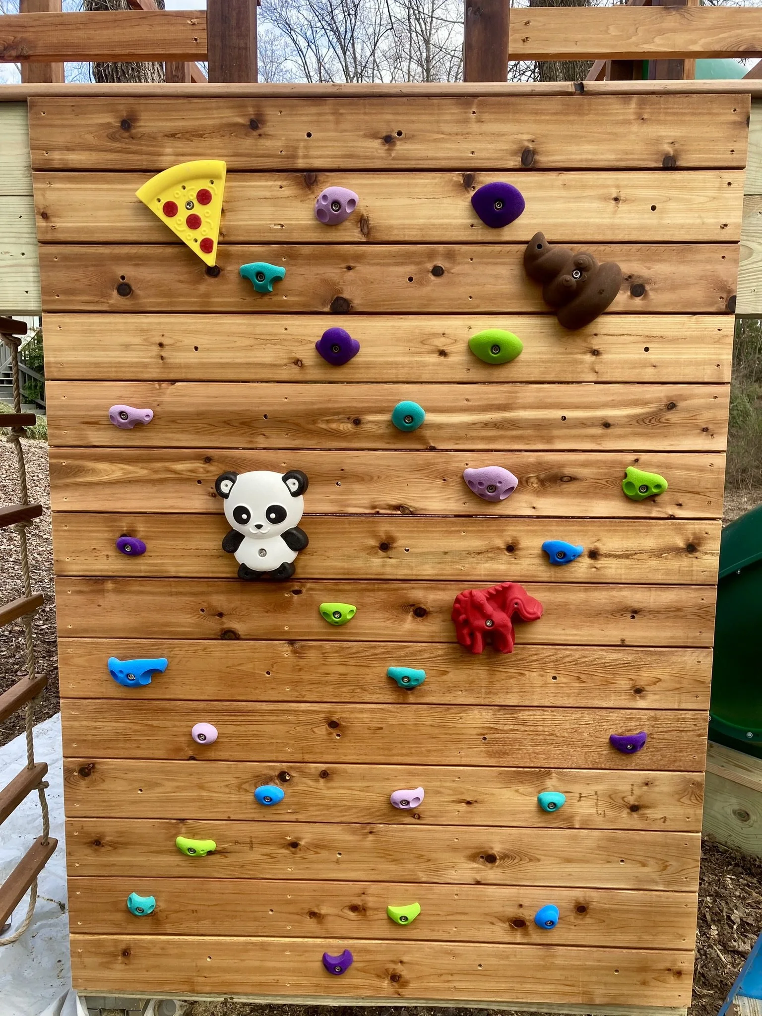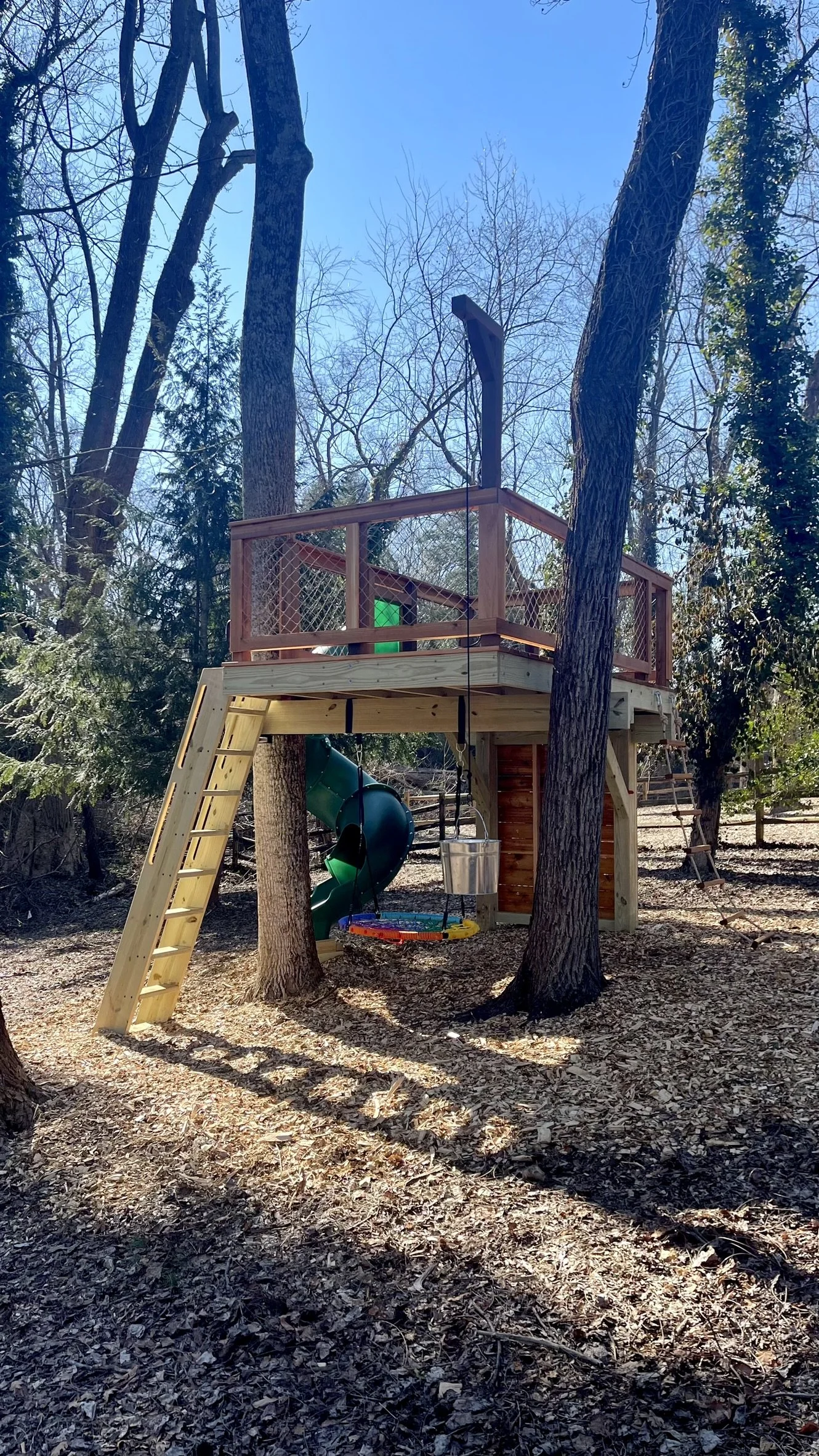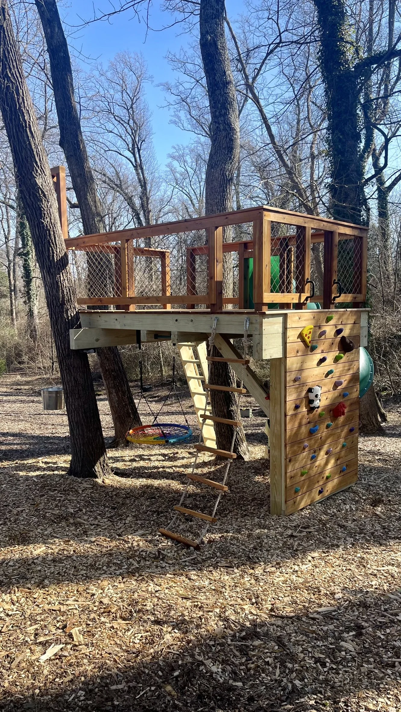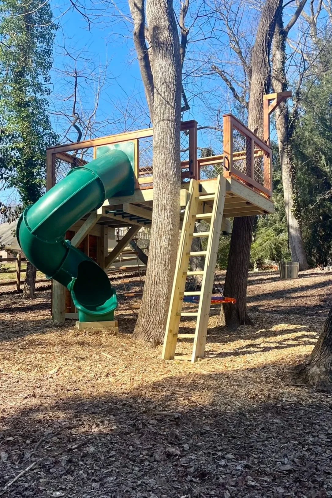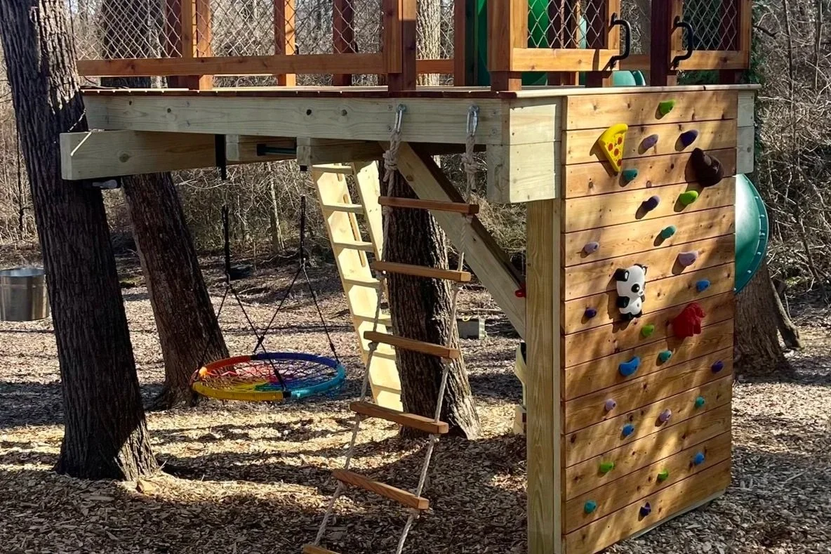This elevated backyard playscape combines custom craftsmanship with playful details. The build features a climbing wall with themed holds, a rope ladder, and an access ladder leading to the main platform. Diamond safety netting surrounds the deck, while a large spiral slide offers a thrilling way back down. Unique, colorful climbing holds make this project one-of-a-kind, blending challenge, fun, and imaginative play.