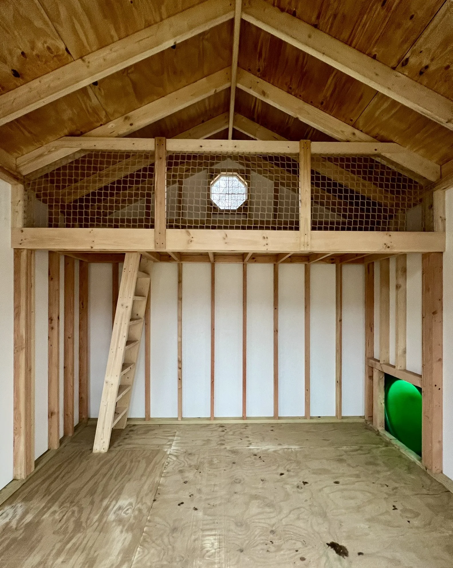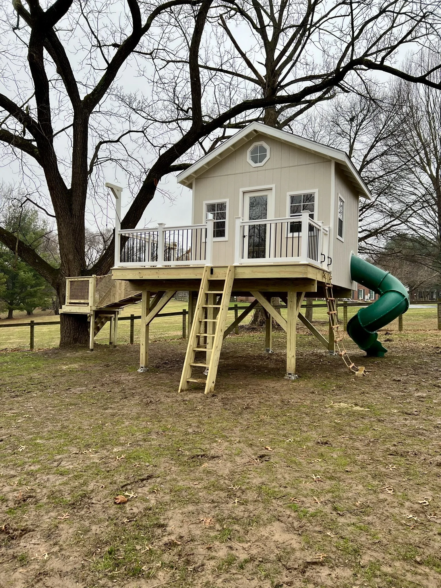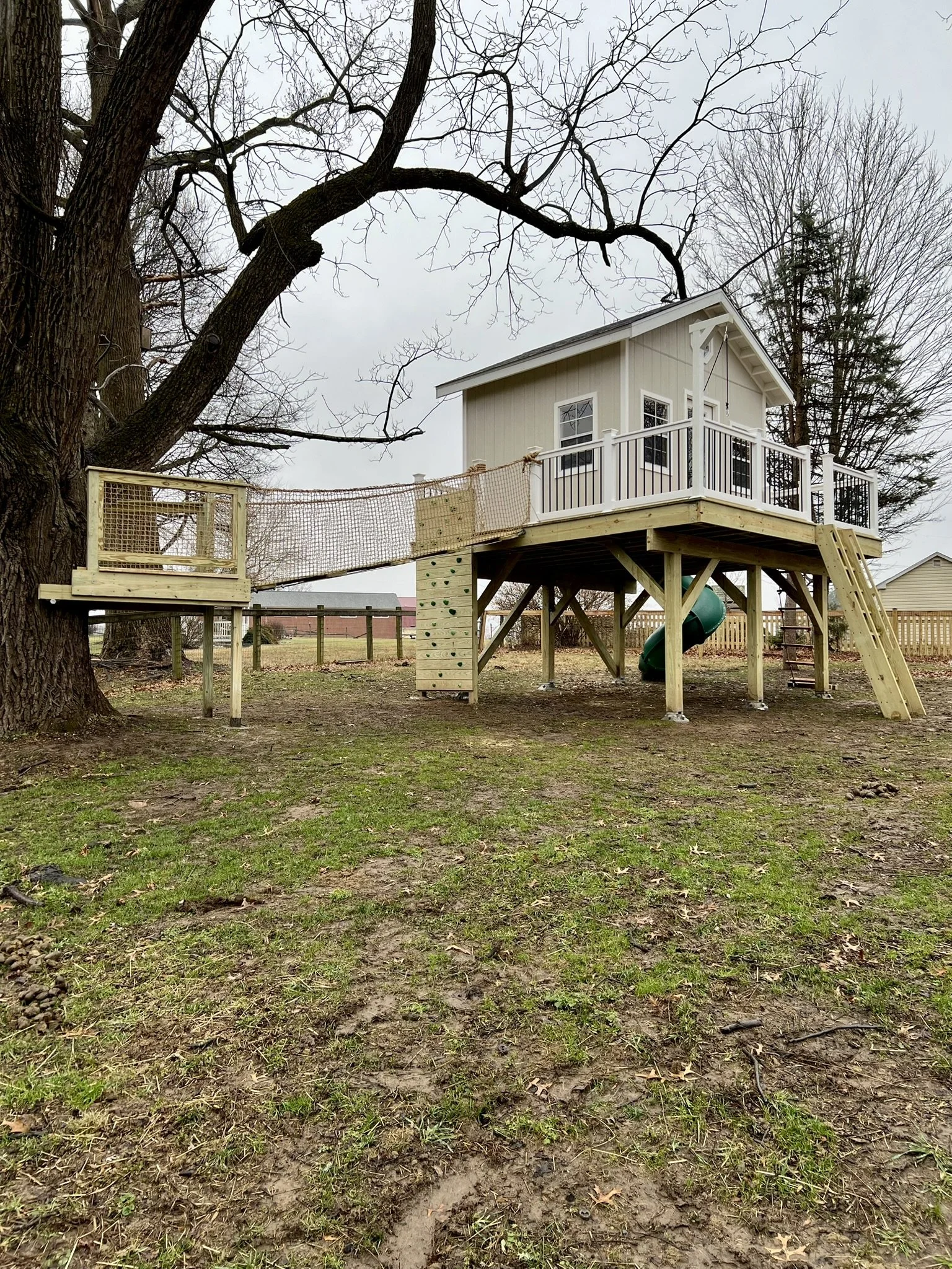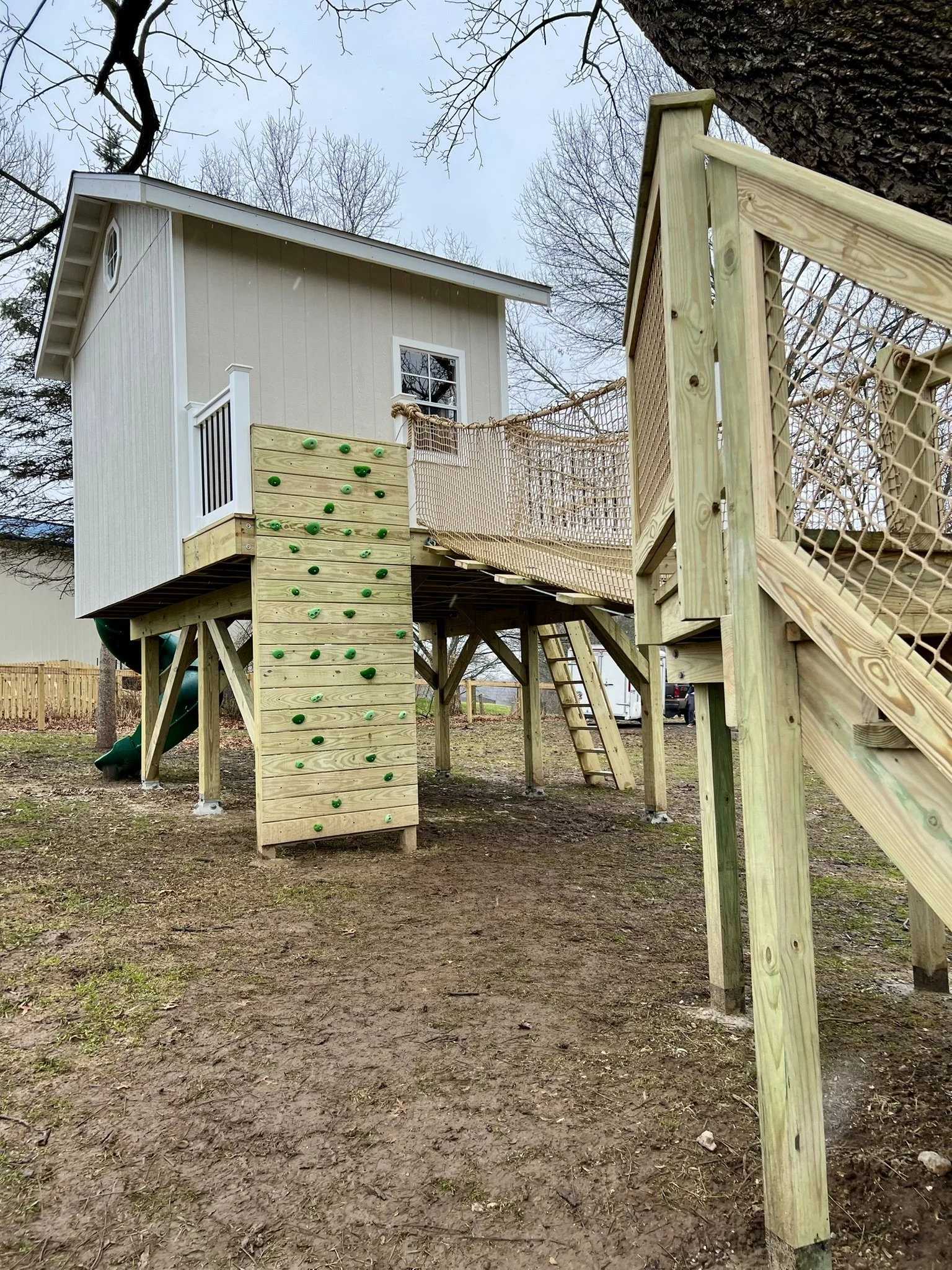 Built as a backyard retreat for the whole family, this finished treehouse includes windows, doors, and a loft-style interior for hanging out together. Outside, kids can climb up the rope ladder, wooden ladder, or rock wall before racing down the spiral slide. A rope bridge adds an extra adventure element, making this one of our biggest and most versatile builds to date.