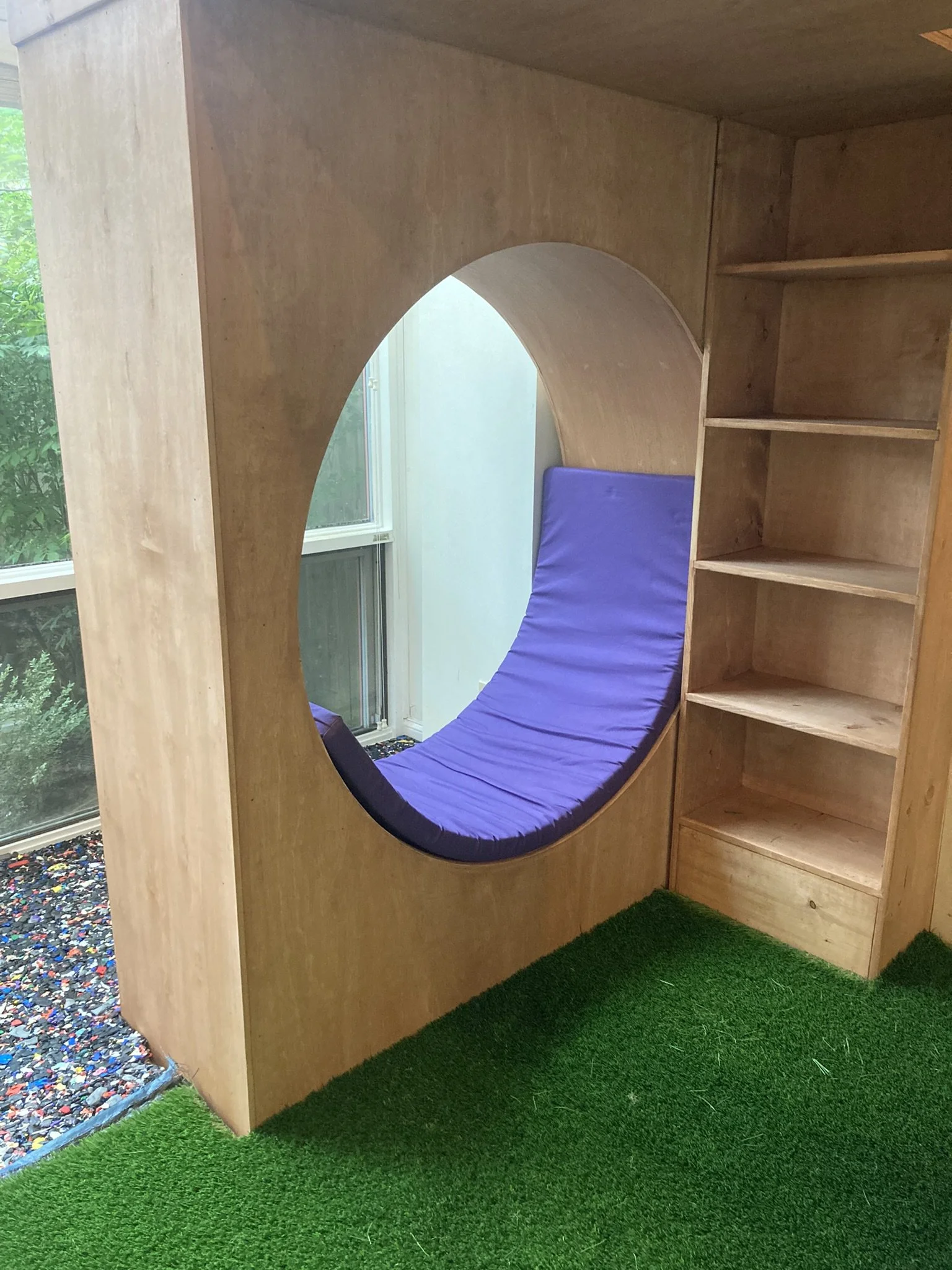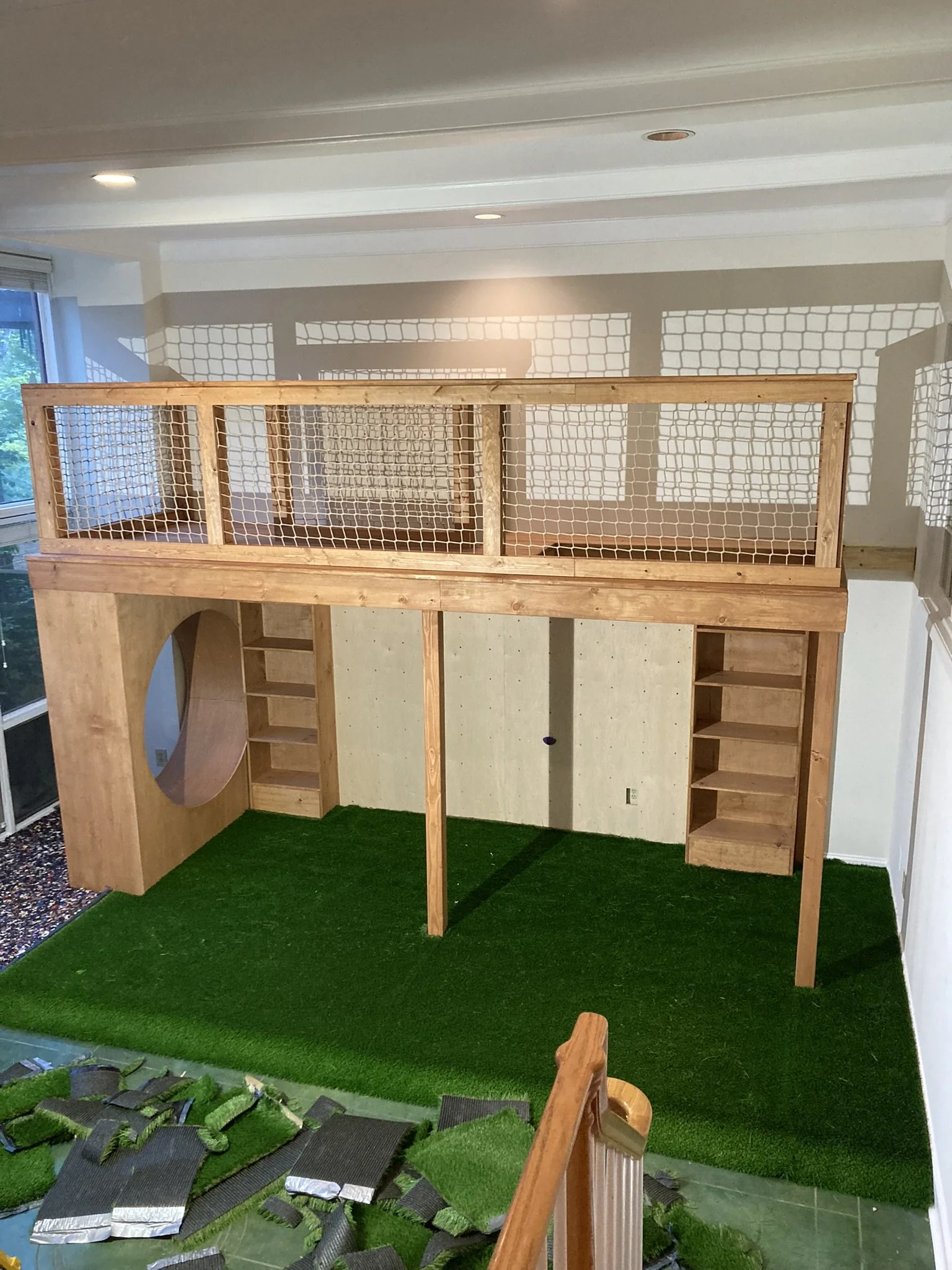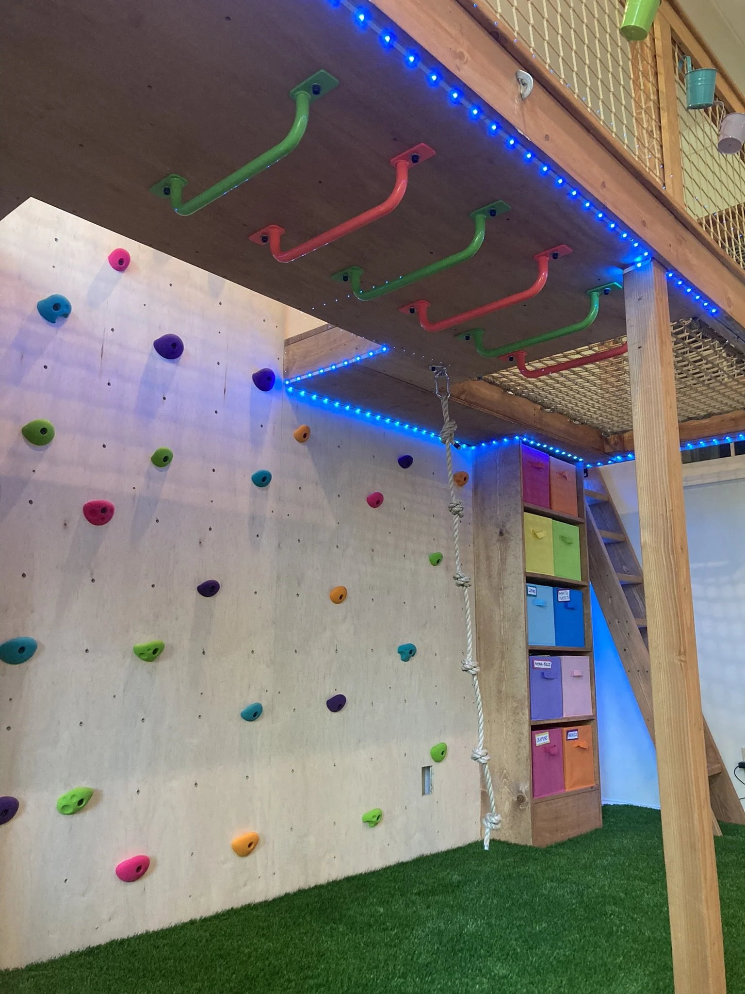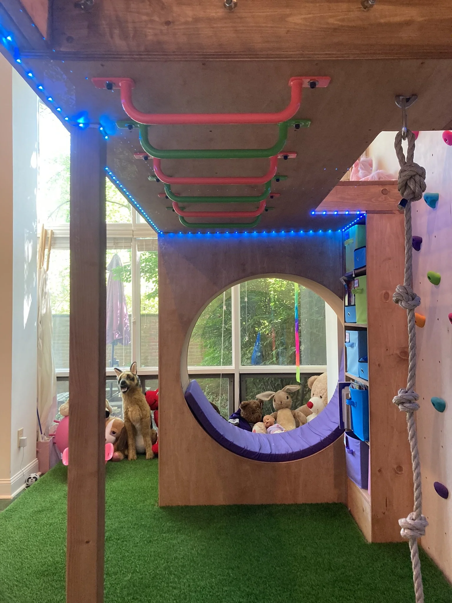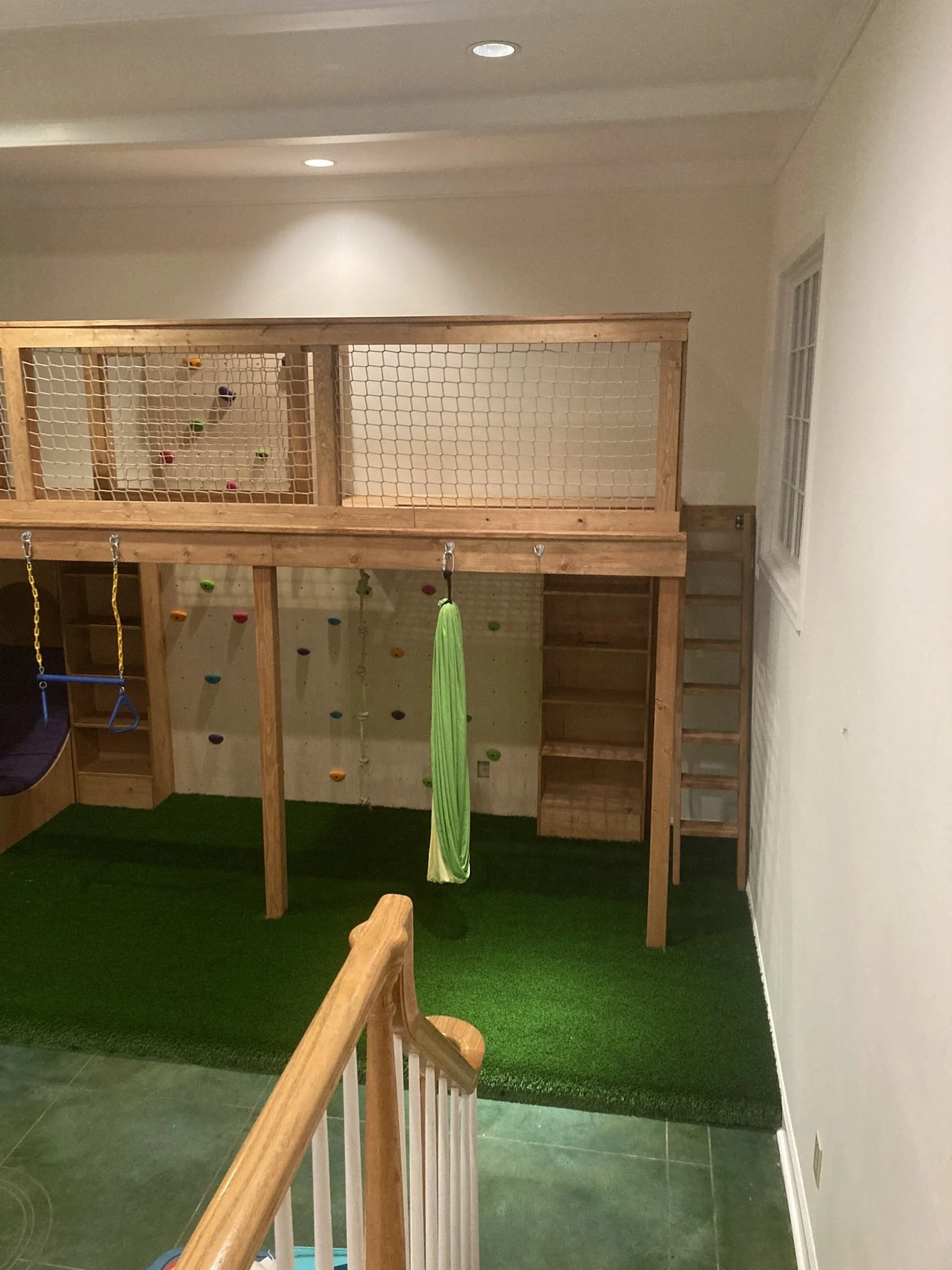 This custom indoor playroom combines adventure and creativity in one space. Designed with a climbing wall, monkey bars, rope swing, and an upper platform, it keeps kids active year-round. A cozy circular reading nook, turf flooring, and built-in cubbies add comfort and organization, making this a fun and functional space for the whole family.