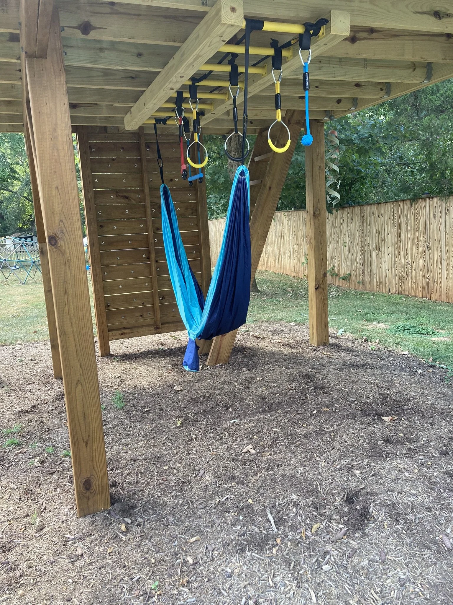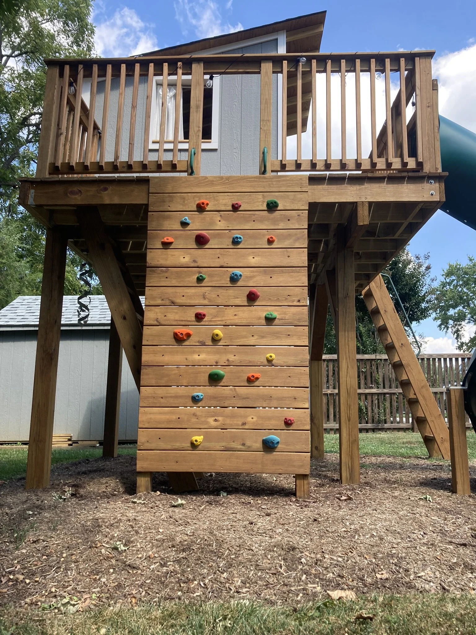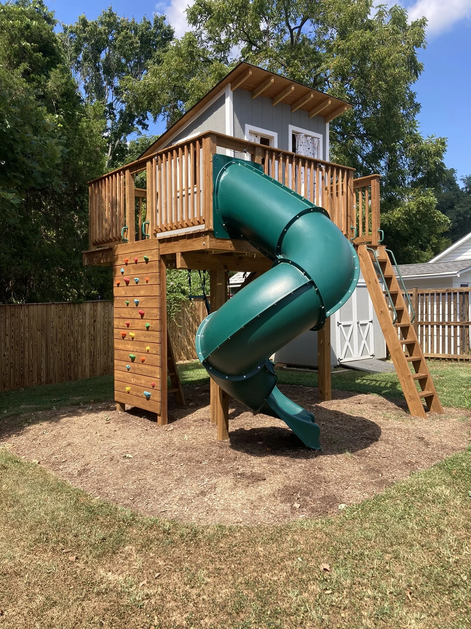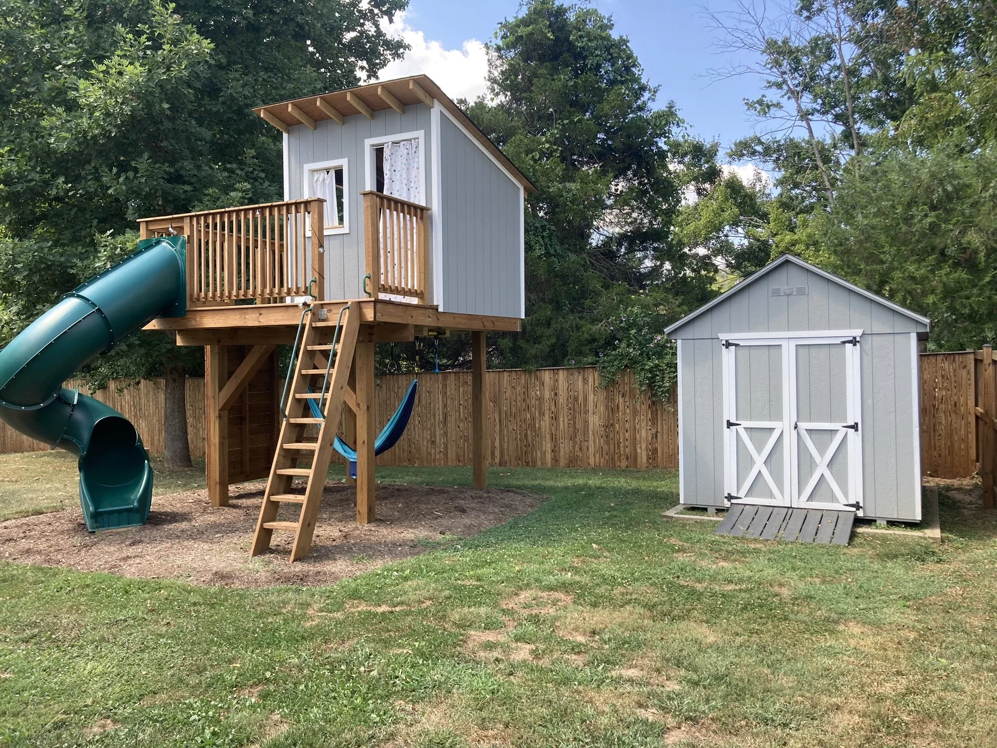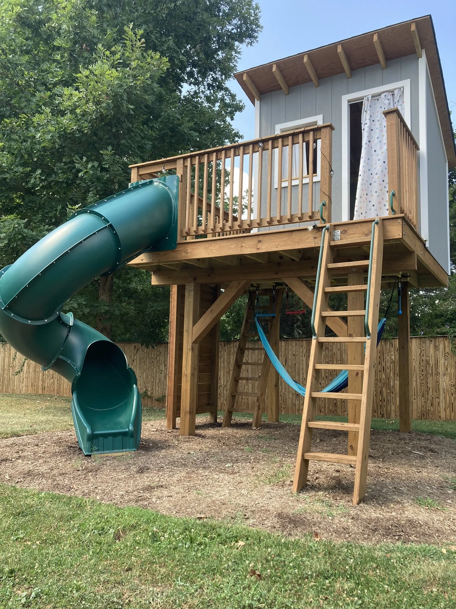 This backyard build, nicknamed the “Little Blue House,” combines a cozy treehouse-style platform with plenty of play features. Kids can climb up the wall or ropes, swing in the hammock, cross the monkey bars, and race down the spiral slide — all from one versatile structure designed for hours of outdoor fun.