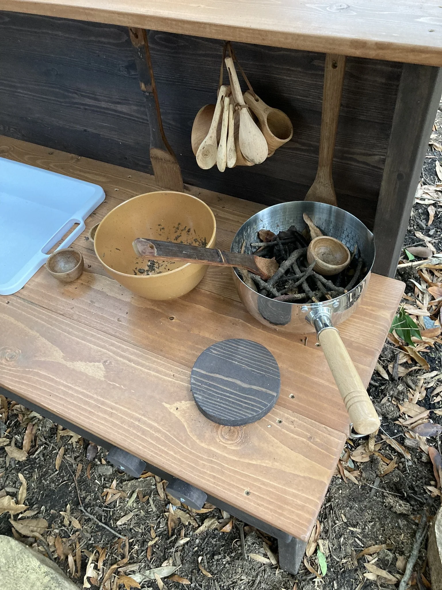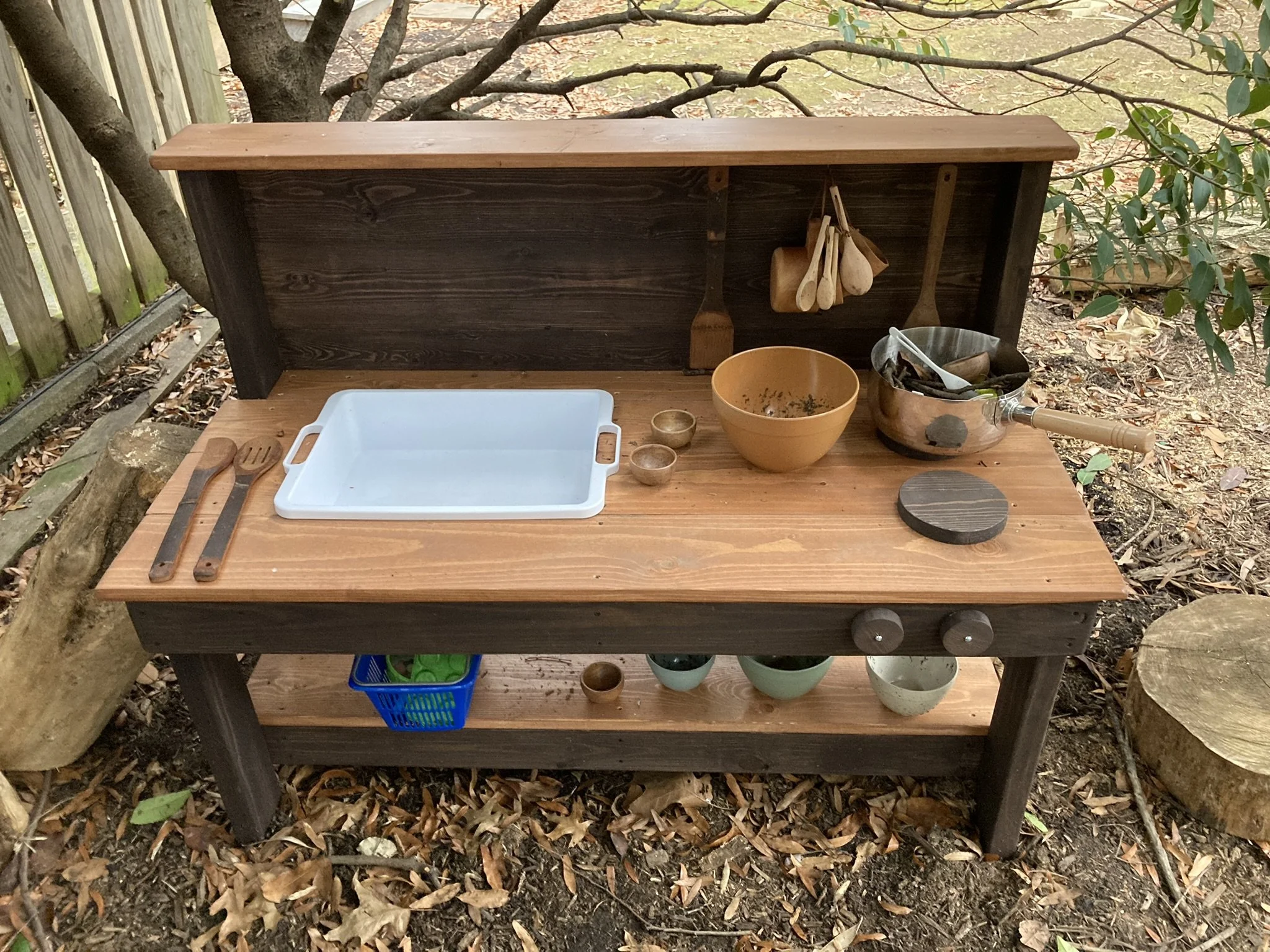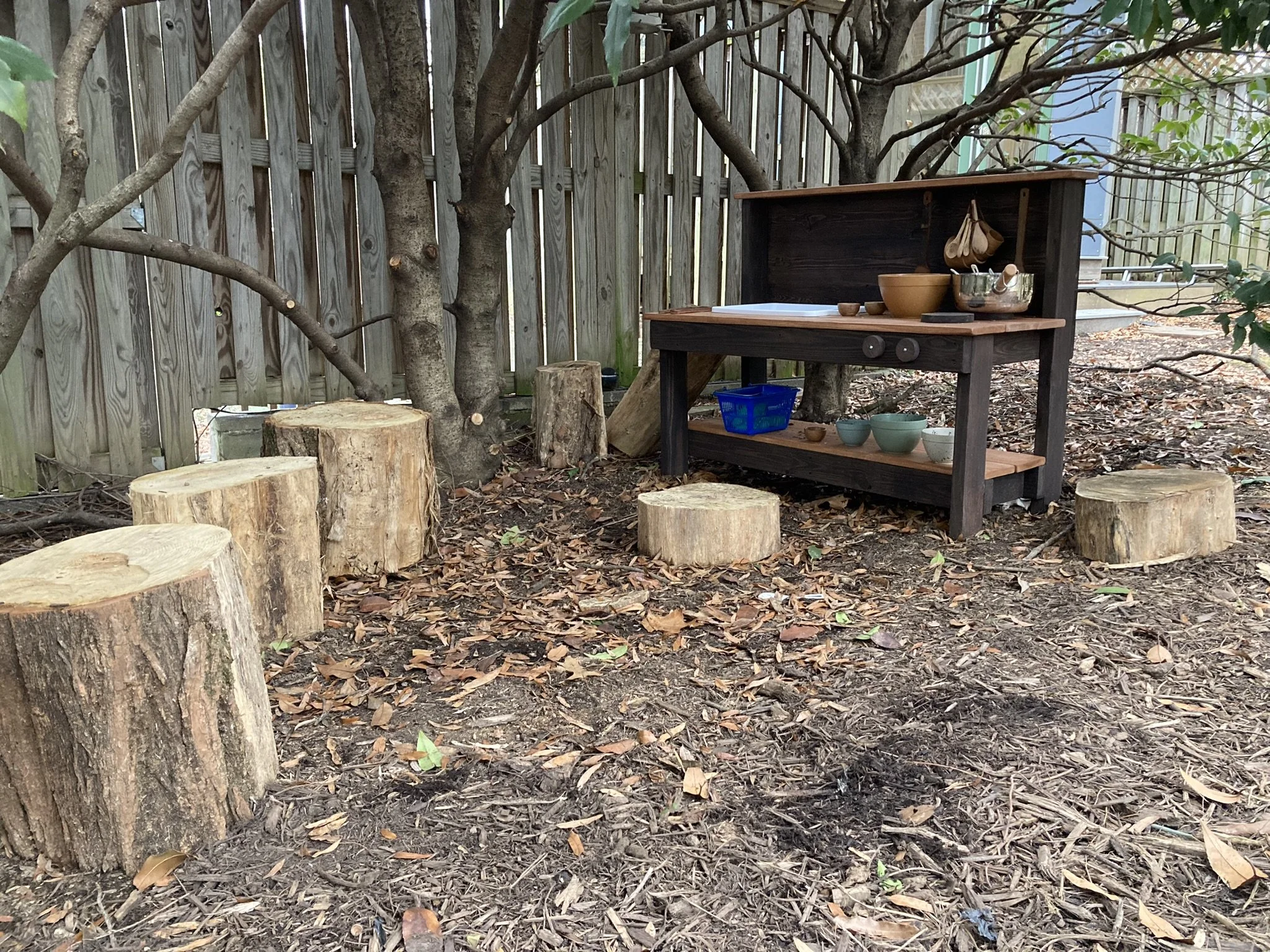 This custom backyard build features a Ninja Warrior–inspired climbing wall with a variety of holds, bars, rings, and ropes for swinging, climbing, and testing balance. To complement the action, we added a natural outdoor mud kitchen surrounded by log seating — the perfect spot for creative, messy play and imagination.