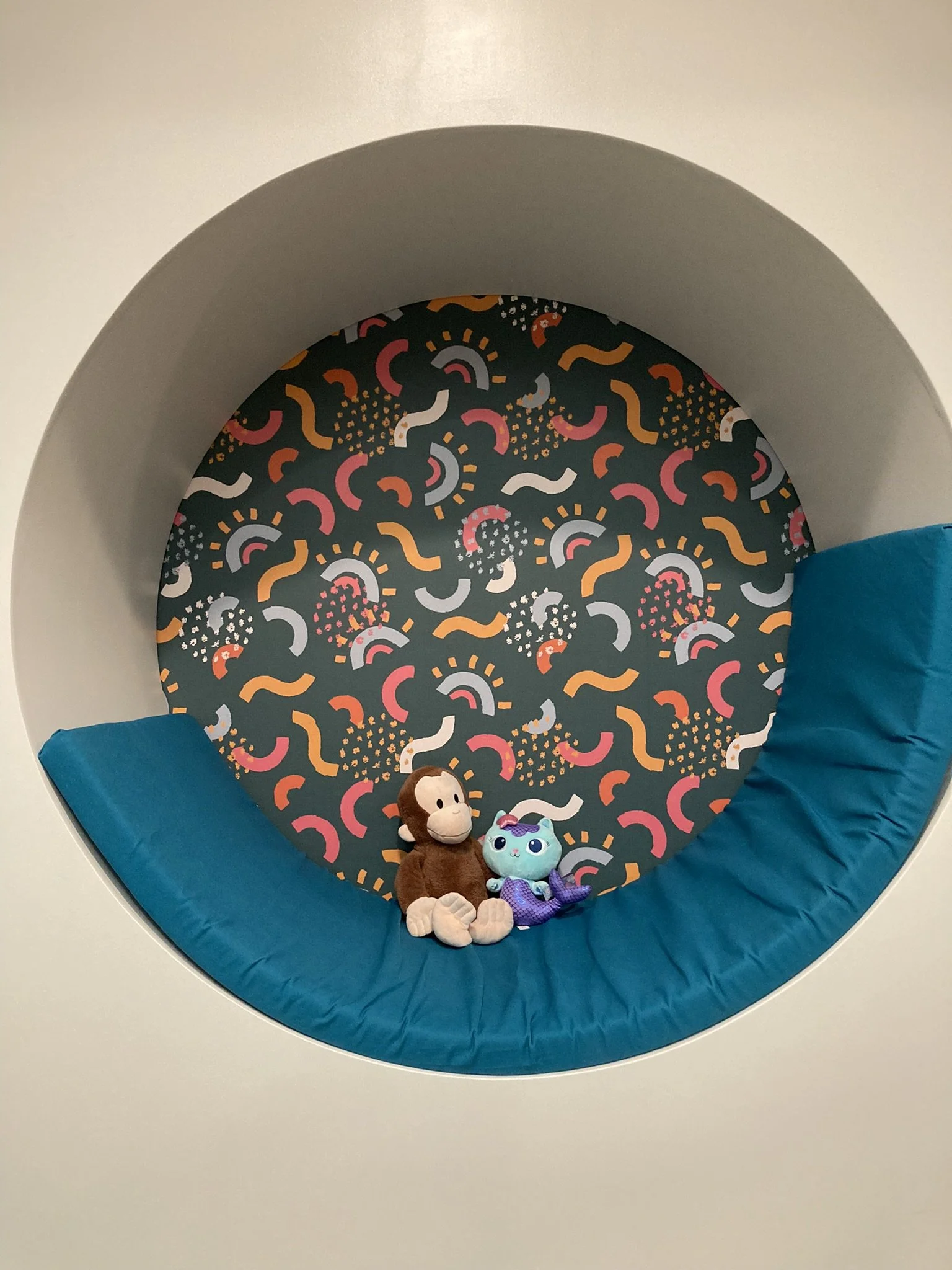 This custom basement build was transformed into a full indoor playground and reading retreat. The space includes a foam pit, monkey bars, climbing wall, and rope wall for active play, paired with a cozy circular reading nook and built-in shelving. A cloth swing adds movement and relaxation, while custom cutouts and bold design elements give the room a playful, modern feel. Even a closet was converted into a hidden play space, making this basement a one-of-a-kind adventure zone for kids.