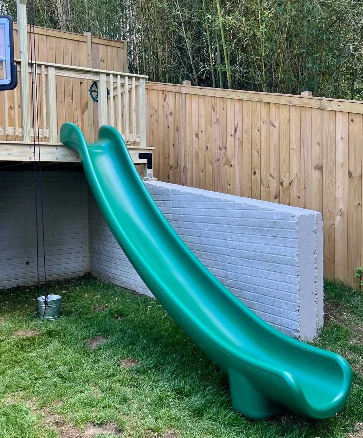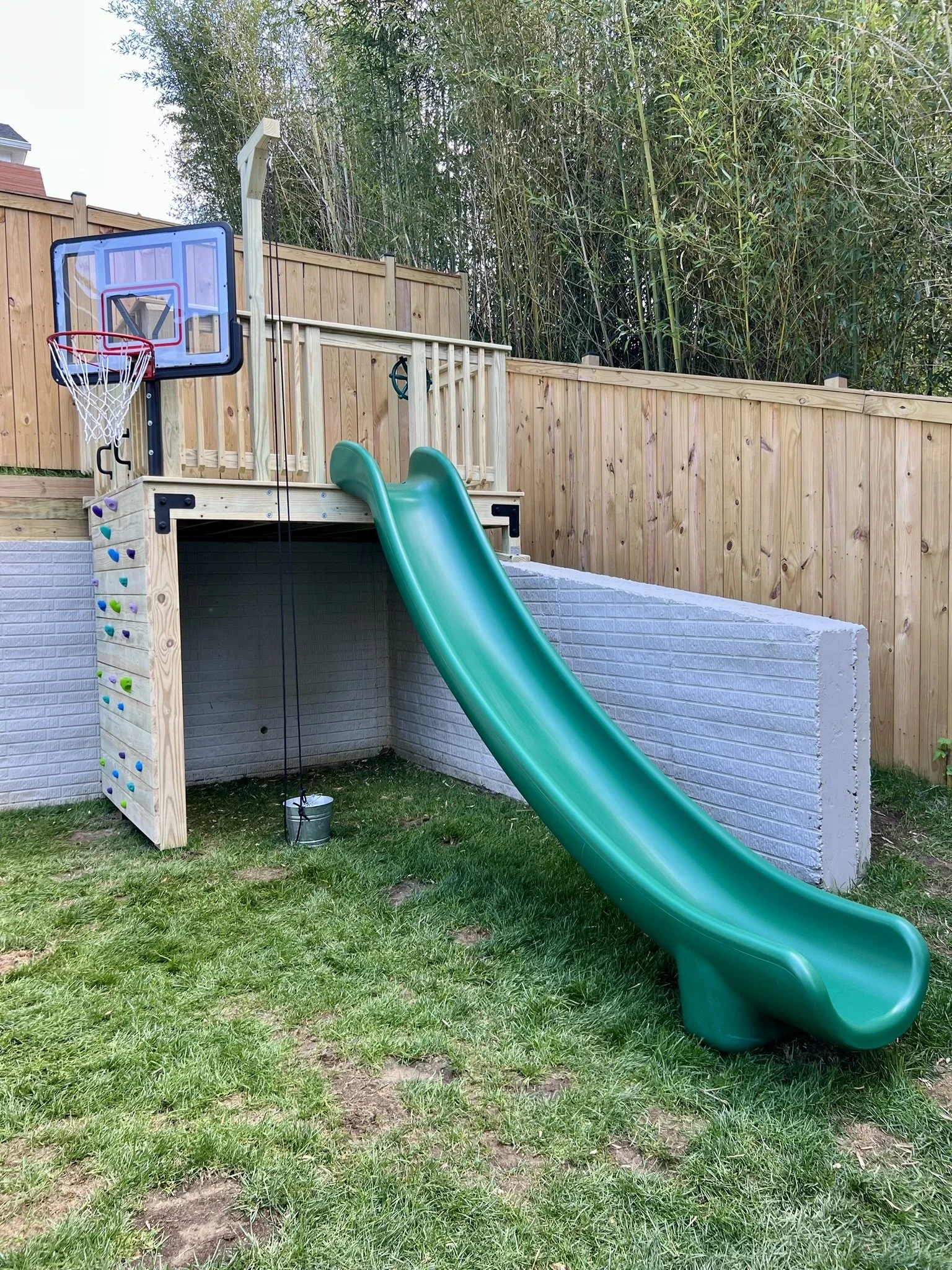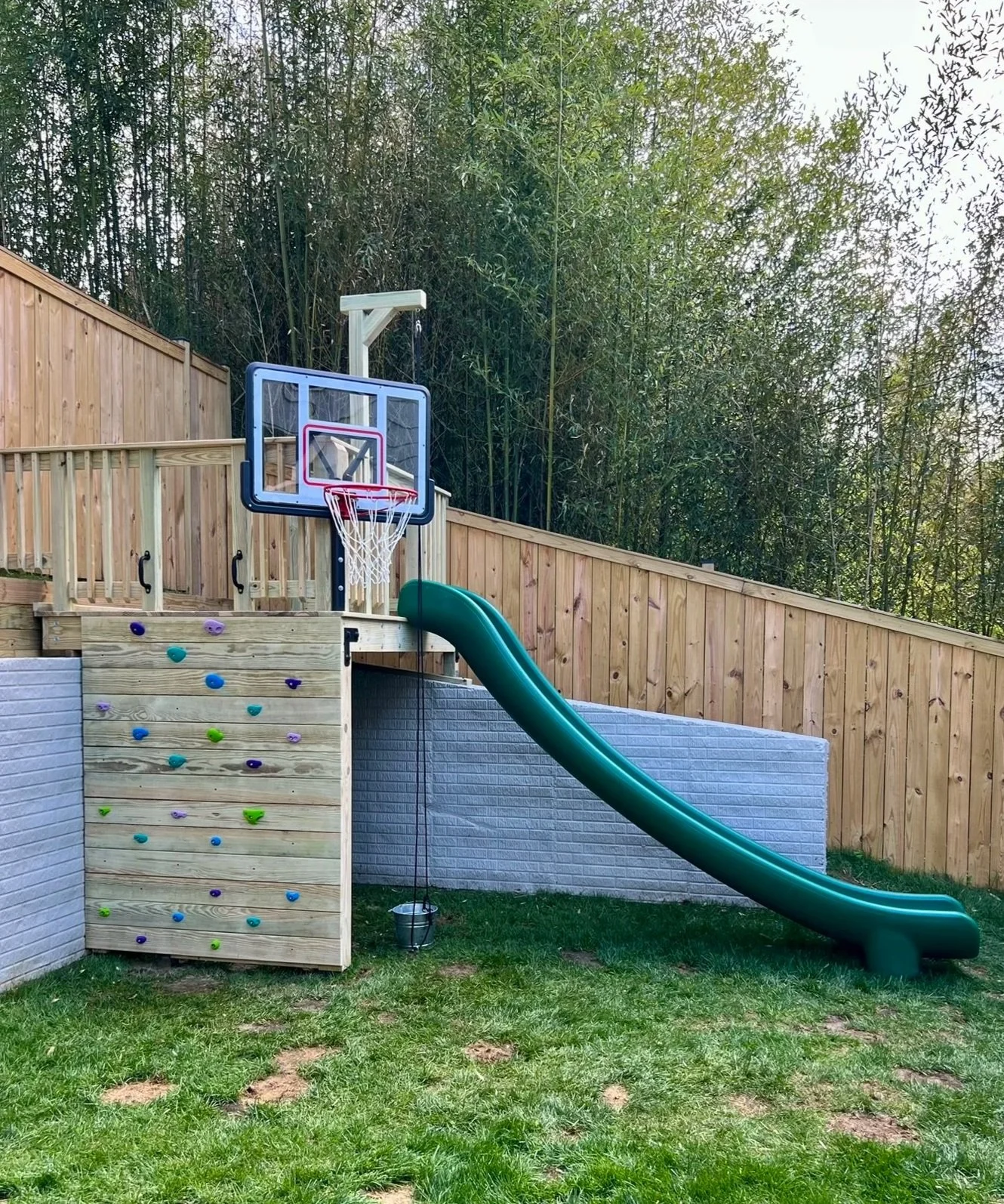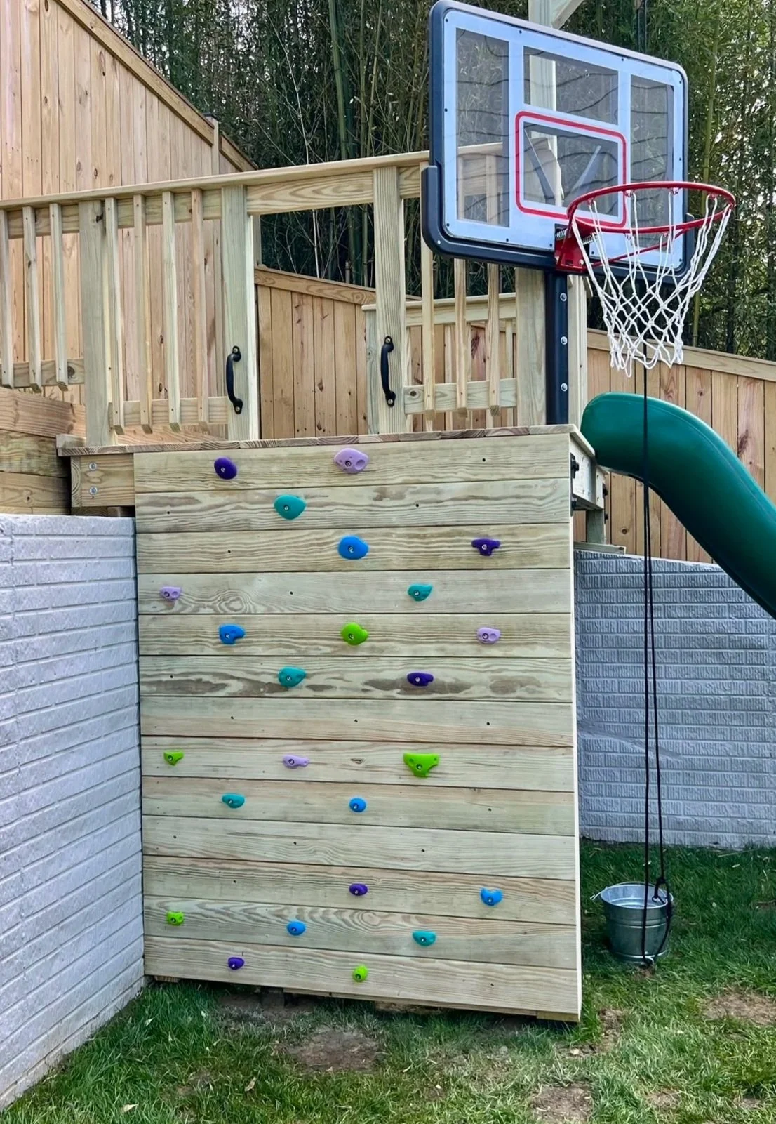 Built directly into a backyard retaining wall, this custom playscape makes the most of available space while creating endless opportunities for play. The design features a colorful climbing wall, elevated platform, and slide, along with a mounted basketball hoop for active sports fun. By blending climbing, sliding, and shooting hoops, this unique build transforms a simple retaining wall into a multi-purpose playground.