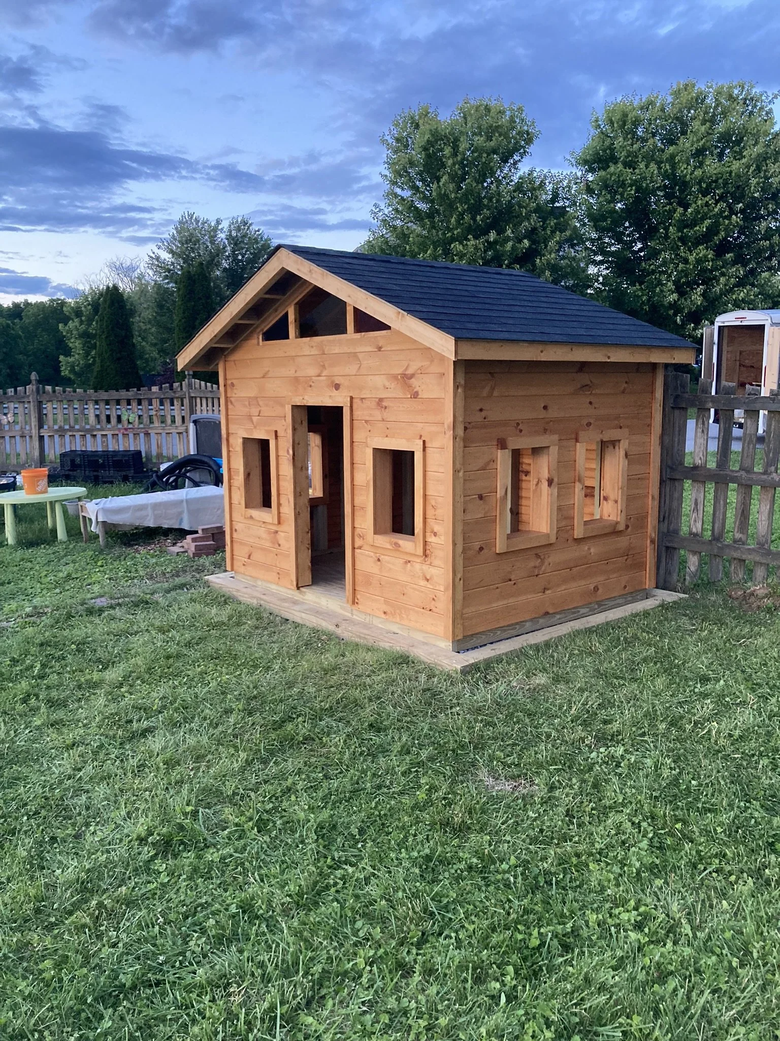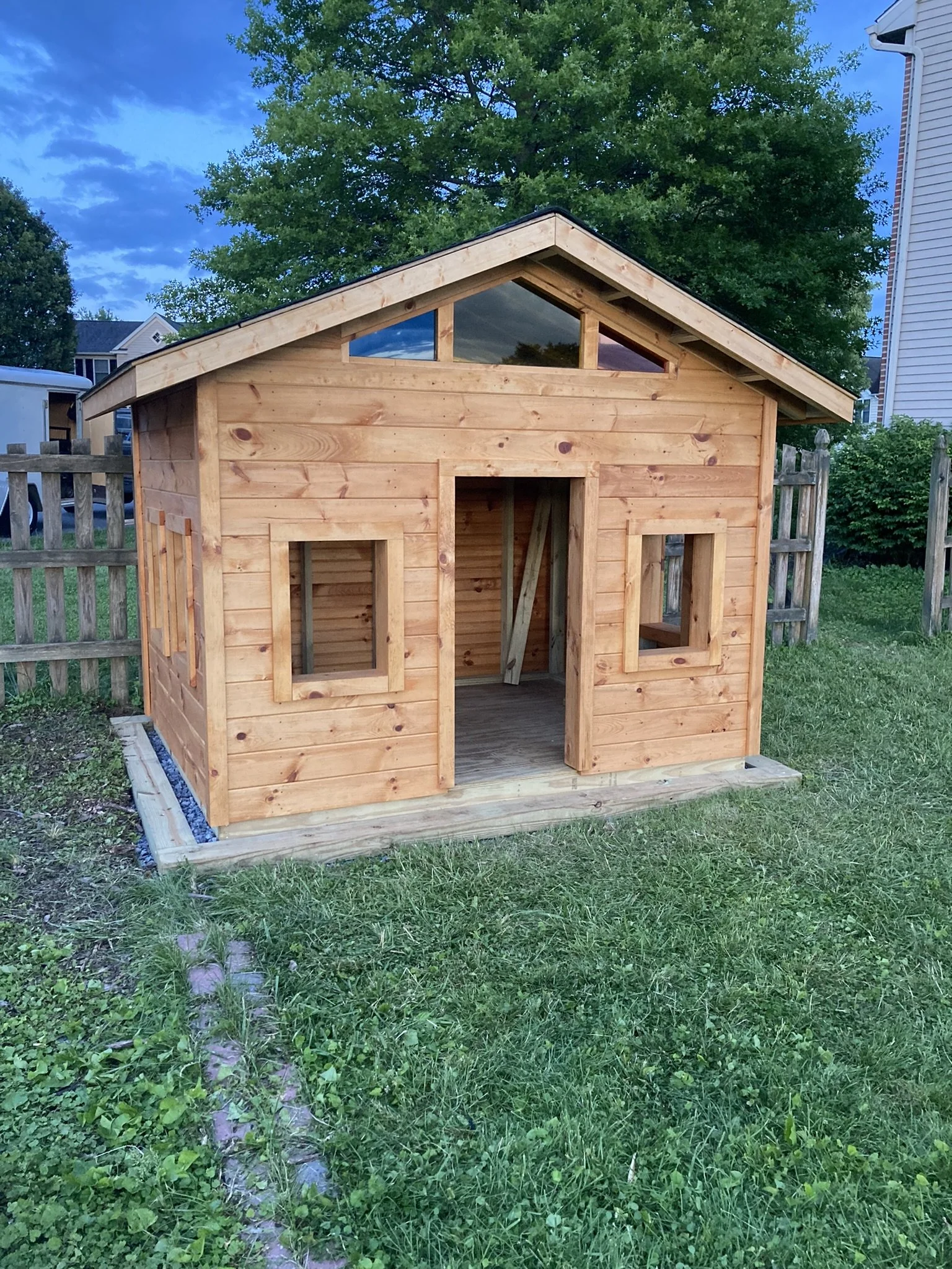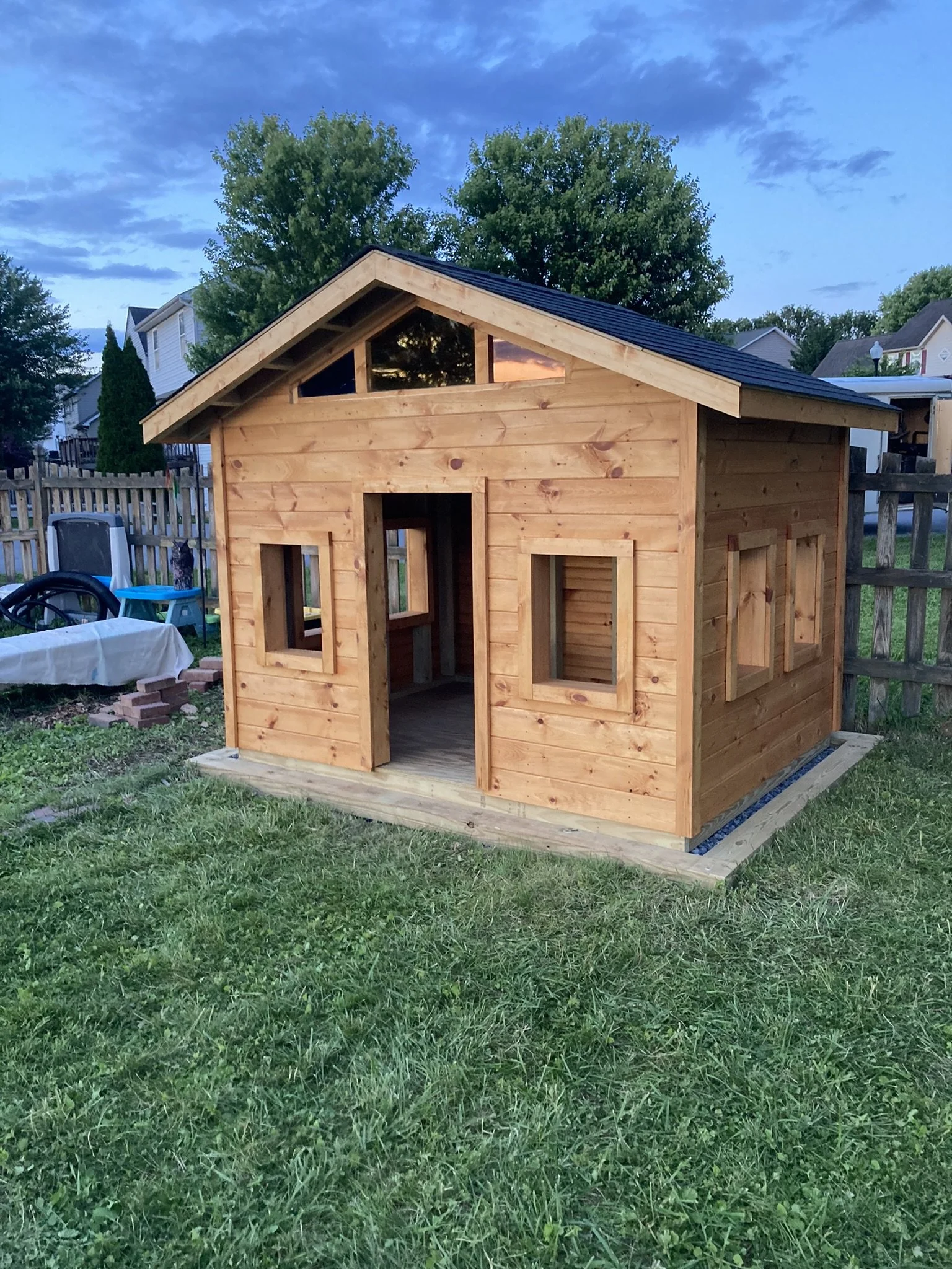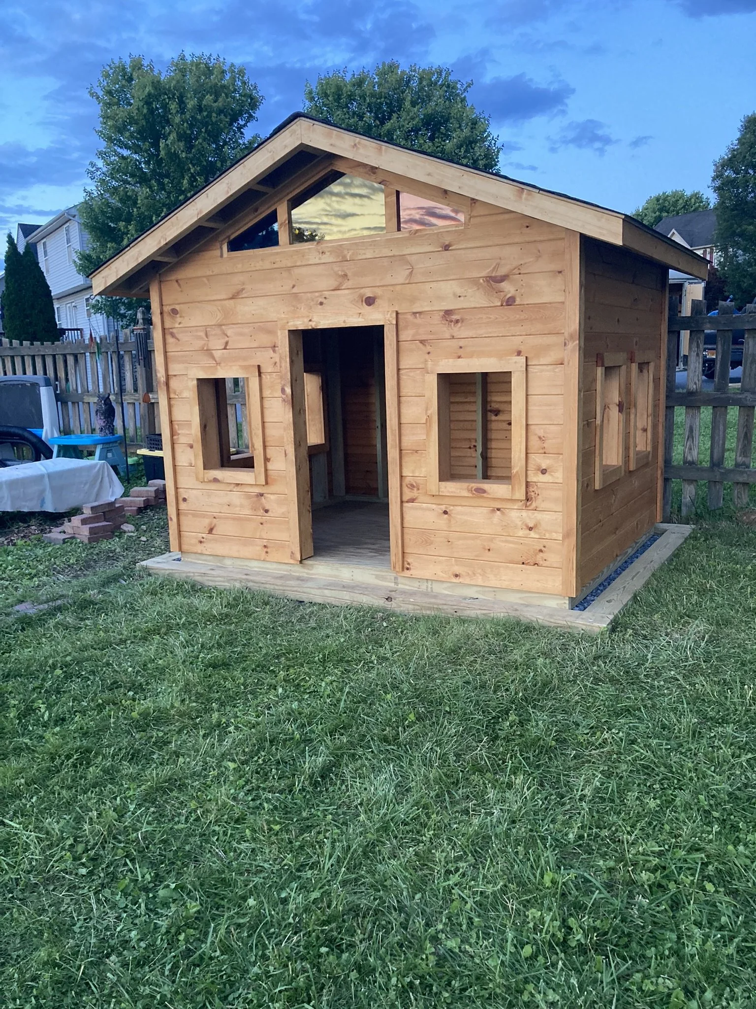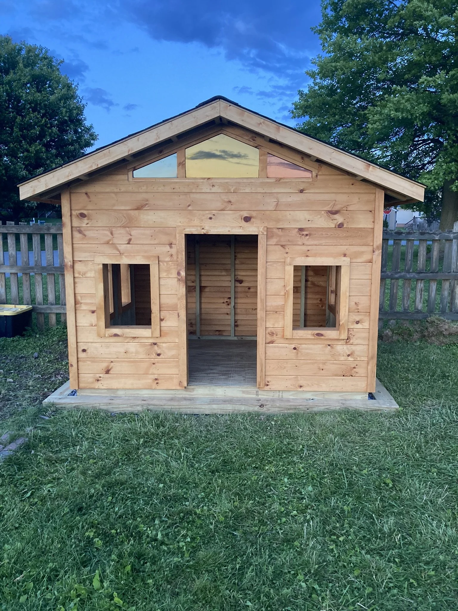This handcrafted wooden playhouse features colorful windows that glow when the sun hits just right. With a classic cabin-style design, open windows, and a cozy interior, it’s the perfect backyard hideaway for imaginative play.