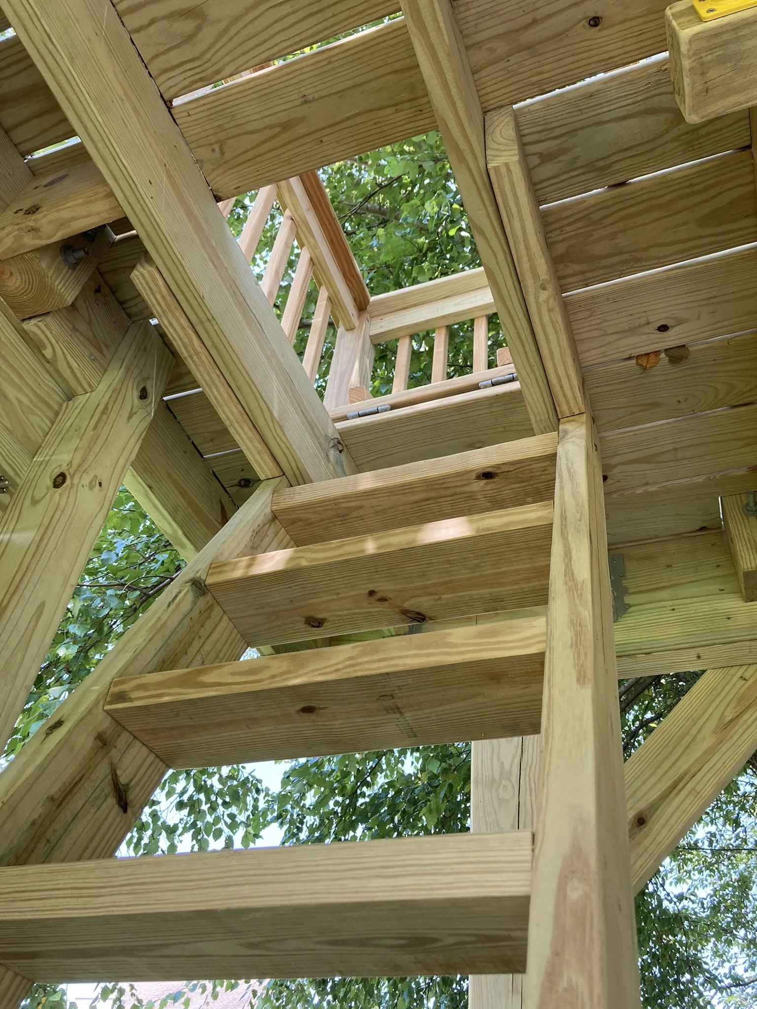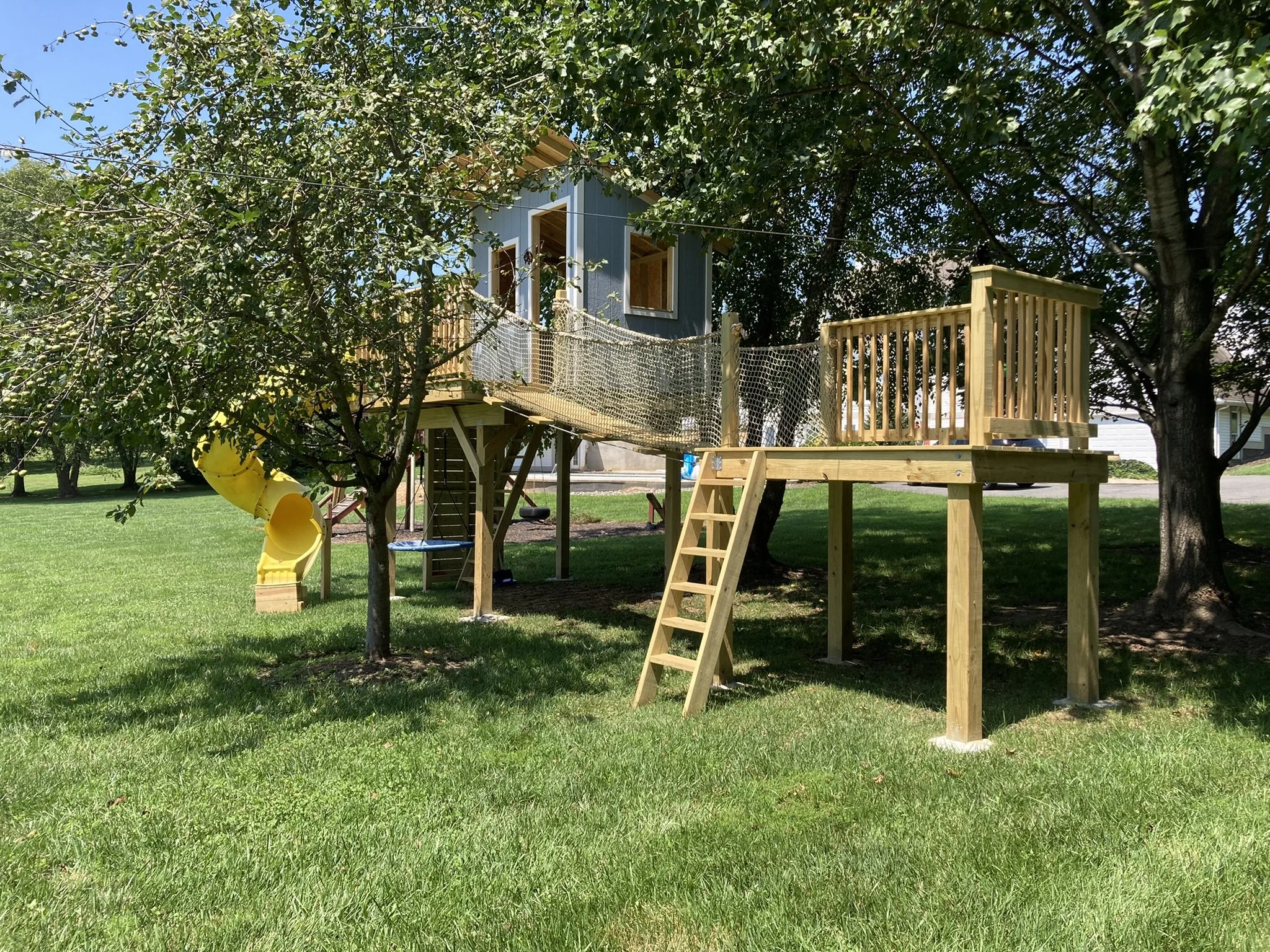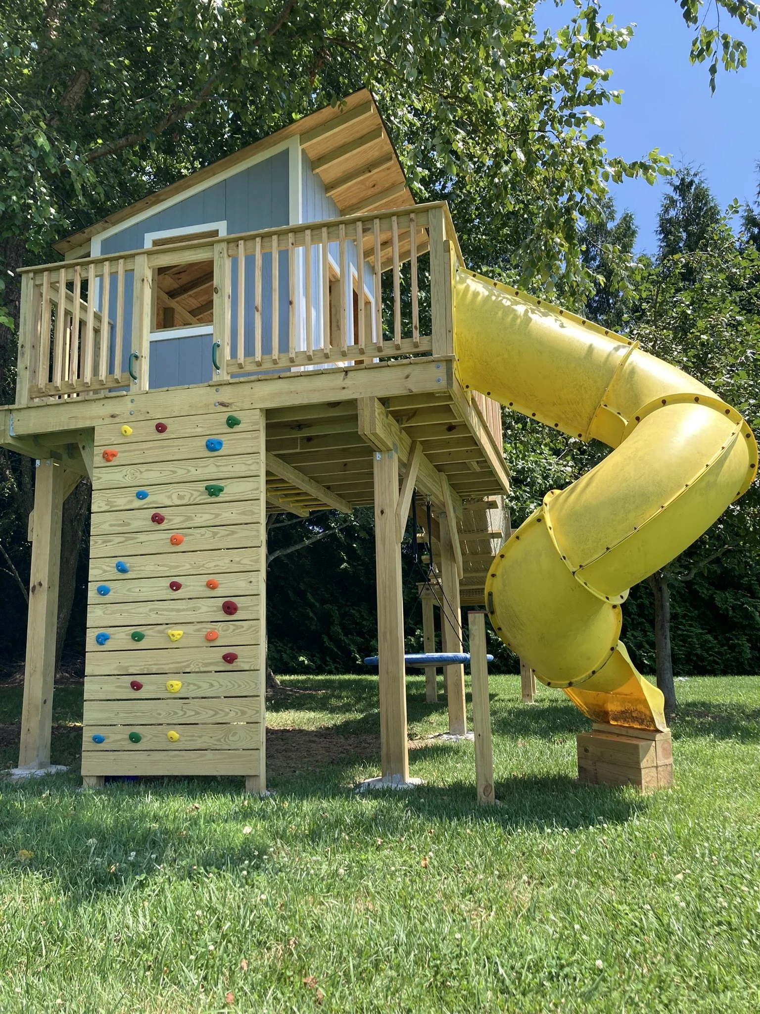 This custom playscape delivers the complete adventure experience. A handcrafted treehouse connects to a zip line platform by a sturdy rope bridge, while climbing walls, monkey bars, and ladders offer endless challenges. Finished with a bright spiral slide and built-in swing space, this project was designed for nonstop play and backyard fun.